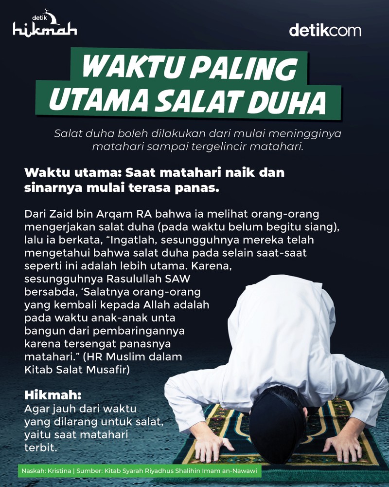 Kapan Waktu Paling Utama Salat Dhuha? BAGIKAN URL telah disalin Salat duha dapat dilakukan sejak matahari meninggi hingga sebelum zuhur. Namun kapan waktu yang paling utama melaksanakannya? (Foto: Luthfy Syahban/detikcom)