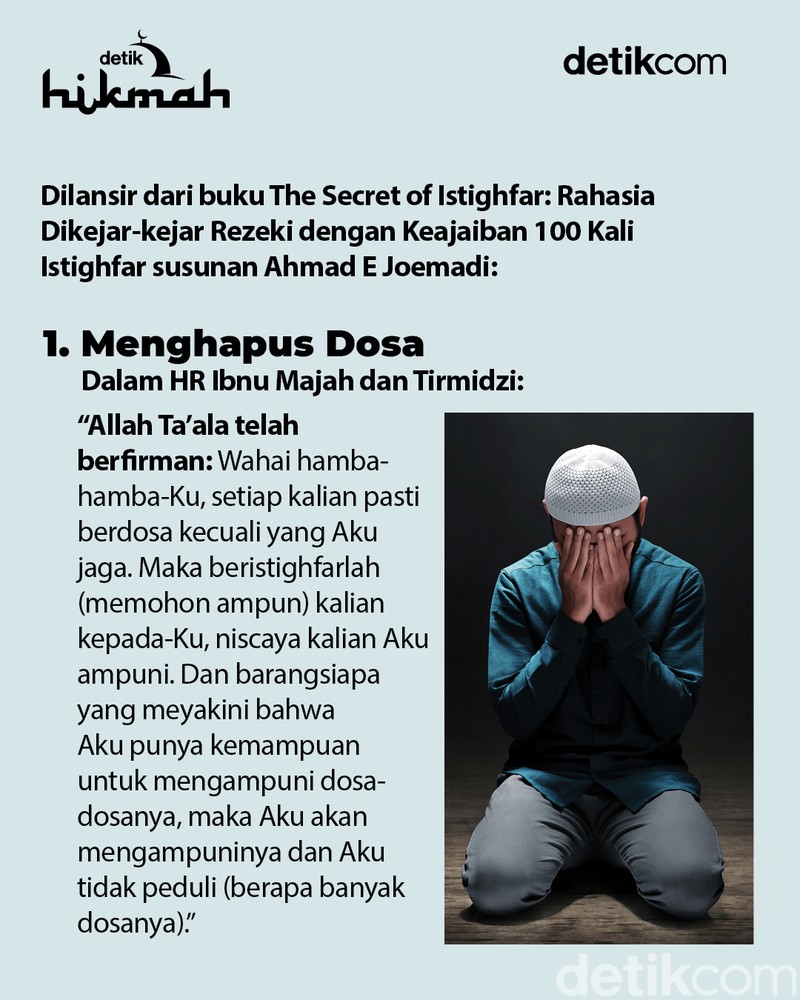 Istighfar merupakan amalan yang sederhana tapi sangat mulia dalam Islam. Istighfar secara bahasa berarti meminta ampun kepada Allah SWT. Istigfar jadi bentuk pengakuan kelemahan diri seorang hamba di hadapan Allah SWT. Foto: Tim infografis detikHikmah