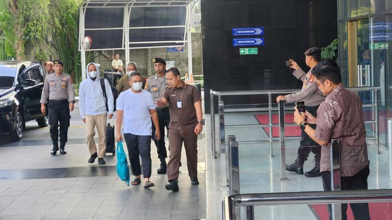 Foto: Gubernur Riau Abdul Wahid (kaus putih) saat tiba di gedung KPK. Wahid dikawal petugas saat masuk ke dalam gedung. (Adrial/detikcom)