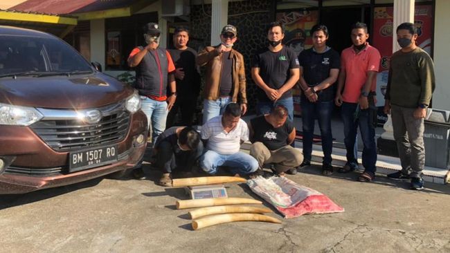 Polisi menangkap tiga orang terkait perdagangan gading gajah di Kuantan Singingi, Riau. Dari pelaku, 4 gading gajah disita.
