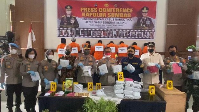 "Pengungkapan penyalahgunaan Narkoba jenis sabu sebesar 41,4 Kg ini adalah capaian terbesar dalam sejarah sejak berdirinya Polres Bukittinggi, maupun Polda Sumbar," kata Teddy Minahasa Putra dalam keterangan pers di Mapolres Bukittinggi, Sabtu (21/5/2022).