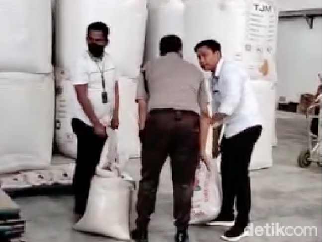 Dalam video itu, terdengar suara seorang wanita. Dia seperti melarang para pria berbaju putih membawa karung beras tersebut. Wanita itu pun menyebut mereka telah melanggar undang-undang.