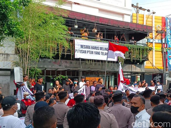 Masa juga membentangkan spanduk bertuliskan "Negara harus melindungi putusan PTUN yang telah inkrah". Personel kepolisian juga sudah terlihat berada di lokasi.
