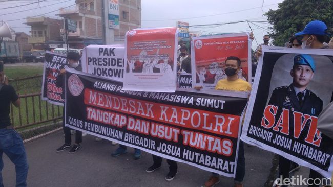 Sekelompok massa yang tergabung dalam Aliansi Pemuda dan Mahasiswa Sumut menggelar aksi demo di depan Mapolda Sumut. Massa menilai pengungkapan kasus kematian Brigadir J atau Nofriansyah Yoshua Hutabarat terkesan lambat.