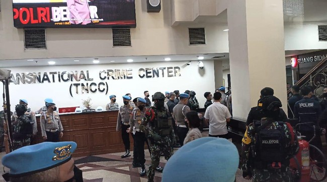 Jakarta - Personel Brimob berseragam lengkap membentak wartawan saat melakukan peliputan sidang etik Irjen Ferdy Sambo di gedung TNCC Polri Jakarta, 25 Agustus 2022. Di sidang etik itu Ferdy Sambo diputuskan diberhentikan dengan tidak hormat.