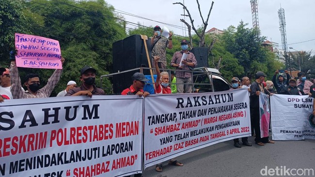 Sekelompok massa yang menamakan diri Rakyat untuk Keadilan dan Supremasi Hukum (Raksahum) berunjuk rasa di depan Mapolrestabes Medan. Mereka menuntut seorang WN Pakistan bernama Shahbaz Ahmad, tersangka kasus penganiayaan segera ditangkap.