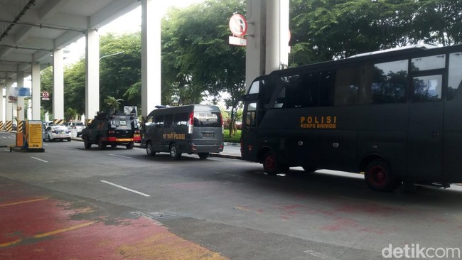 Pada baris pertama tampak mobil lantas, kemudian rantis milik Brimob, di belakangnya ada mobil tahanan dan terakhir bus milik Brimob.