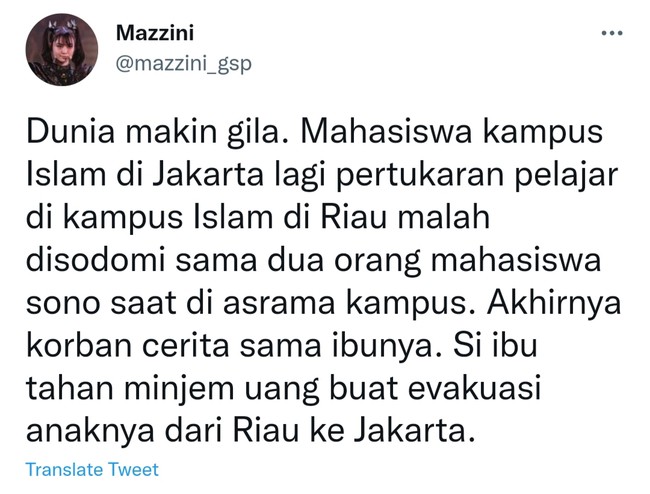 "Dunia makin gila. Mahasiswa kampus Islam di Jakarta lagi pertukaran pelajar di kampus Islam di Riau malah disodomi sama dua orang mahasiswa sono saat di asrama kampus," tulis akun tersebut.