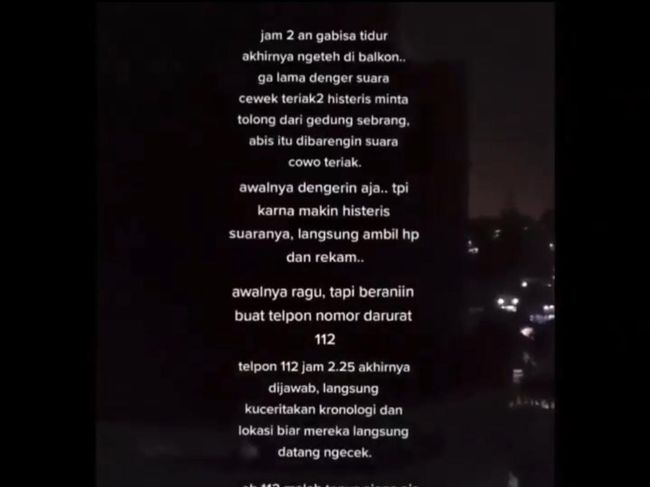 "Jam 02.00 an nggak bisa tidur akhirnya ngeteh di balkon nggak lama dengar suara cewek teriak-teriak histeris minta tolong dari gedung seberang abis itu dibarengi suara cowok teriak," tulis akun tersebut.