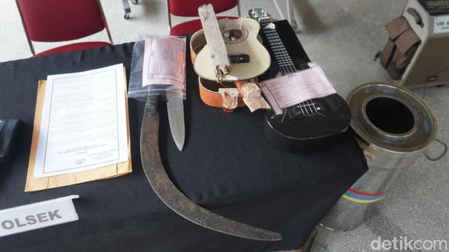 Adapun barang bukti yang diamankan dari pelaku berupa satu bilah celurit ukuran 70 cm, satu bilah pisau stainless, gitar okulele warna hitam, kayu, batu dan tong sampah. Barang bukti dan pelaku pun diamankan di Mapolsek Tampan.