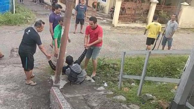 Setelah ditangkap, pelaku yang mengaku warga Kelurahan Sungai Asam, Kecamatan Pasar, Kota Jambi itu langsung diseret dan diikat di tiang listrik sambil menunggu polisi tiba di lokasi.