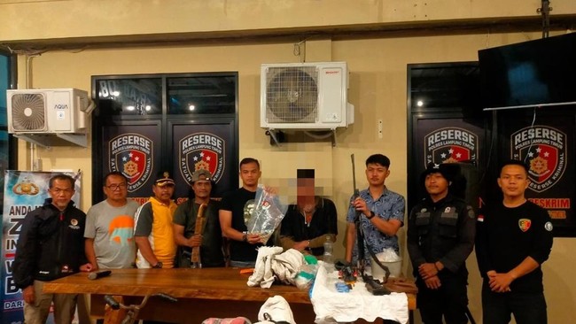 Pria berinisal SL (43) ditangkap usai kepergok hendak berburu rusa di wilayah Taman Nasional Way Kambas. Dari tangan pelaku, petugas mendapatkan barang bukti berupa senjata api rakitan laras panjang lengkap dengan 32 amunisi kaliber 5,56 mm.