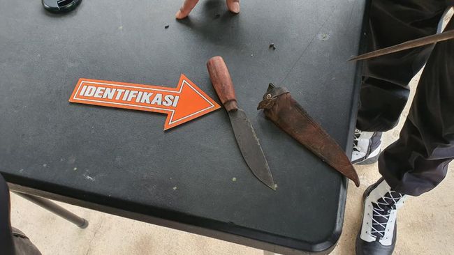 Dari tangan pelaku, polisi mengamankan sebilah pisau bersarung yang terselip di pinggang pelaku dan satu tongkat berisikan pisau kecil berujung runcing di tangan pelaku.