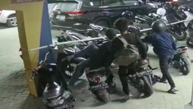 Ketiganya kemudian masuk ke parkiran motor. Lalu, mereka memilih tiga motor yang hendak dicuri. Caranya dengan mematahkan stang motor yang terkunci.