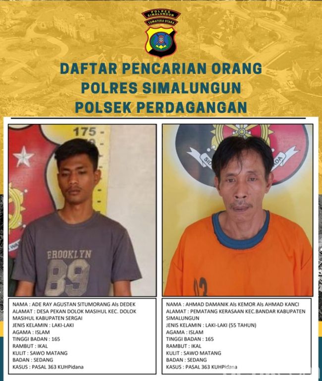 Ronald mengatakan dua tersangka yang masih dikejar itu bernama Ahmad Damanik(55) warga Pematang Kerasaan, Kecamatan Bandar, Kabupaten Simalungun dan Ade Ray Situmorang (21) warga Desa Pekan Dolok Masihul, Kecamatan Dolok Masihul, Kabupaten Serdang Bedagai. Keduanya dijerat Pasal 363 KUHPidana.
