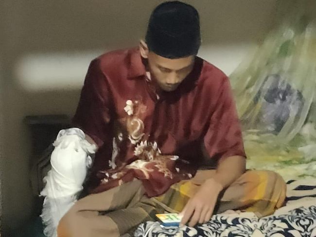"Ini tersangka saat di kamar setelah menusuk korban sambil pegang hp dan pedang di tangan diikat sorban," ungkap Susianto.