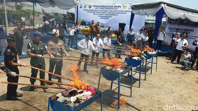 "Untuk barang yang dimusnahkan hari ini ada 634 bal baju dan sepatu bekas. Lalu, 15 kantong rempah-rempah dan obat-obatan herbal," kata Kepala Kantor Wilayah Direktorat Jenderal Bea Cukai Sumatera Utara (Sumut), Parjiya, Senin (10/4/2023).