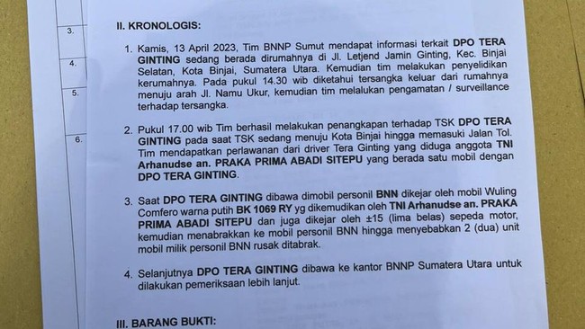 Terdapat informasi di dalamnya menyangkut kronologis penangkapan DPO Tera Ginting. Bahwa Tera ditangkap pada Kamis (13/4/2023) sekitar pukul 17.00 WIB oleh personel Bidang Pemberantasan BNNP Sumut di Jalan Namu Ukur, Langkat.