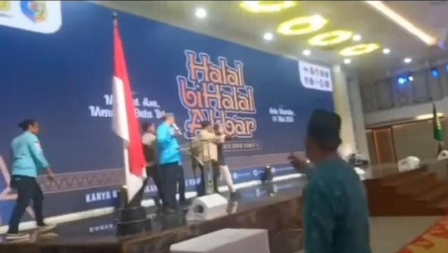 Amatan detikSumut, dari video yang beredar, Minggu (14/5/2023), tampak seorang pria menggenggam pelantang suara dengan menggunakan baju organisasi yang diduga IPPMB naik ke atas panggung.