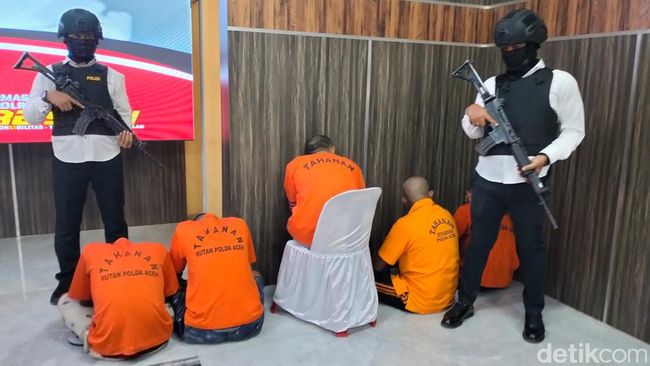Kelima tersangka dihadirkan dalam konferensi pers yang digelar di Mapolda Aceh, Rabu (12/7/2023). Mereka dikawal ketat polisi bersenjata lengkap.