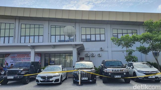 Pantauan detikSumut Jumat (22/9/2023), barang mewah yang disita dari Ari dihadirkan saat pemaparan kasus di Mapolda Riau. Ada lima mobil mewah yang disita.