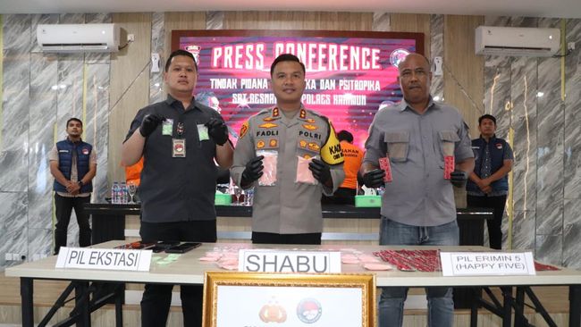 "Untuk di Kecamatan Tebing, Satresnarkoba mengamankan 4 orang pelaku dengan inisial MM, MR, OI dan AS. Barang bukti yang disita dari para pelaku berupaya 1.224,91, 385 butir pil ekstasi dan ekstasi serbuk sebanyak 1,15 garam. pil erimin 5 atau happy five sebanyak 479 butir," ujarnya.
