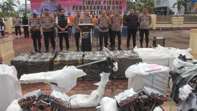 Polres Bengkalis mengungkap kasus penyelundupan barang ilegal. Salah satu barang bukti yang disita yakni mesin motor gede Harley Davidson dengan total Rp 5 miliar.