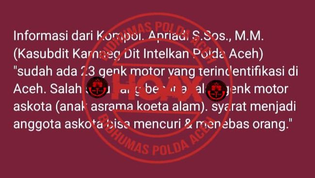 Sebuah pesan yang menyebutkan adanya 23 geng motor di Aceh lengkap dengan lokasi mereka mangkal membuat masyarakat resah. Polisi memastikan informasi tersebut tidak benar alias hoaks.