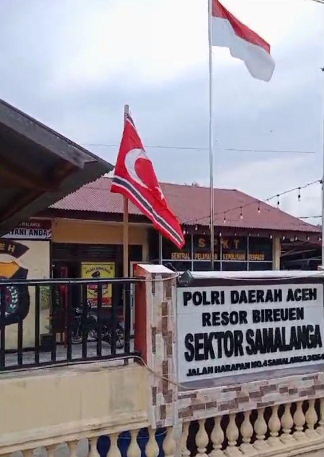 Sebelumnya, video memperlihatkan sejumlah pria mengibarkan bendera bulan bintang di Polsek Samalanga, Bireuen, Aceh beredar. Bendera itu diikatkan di pagar Polsek.