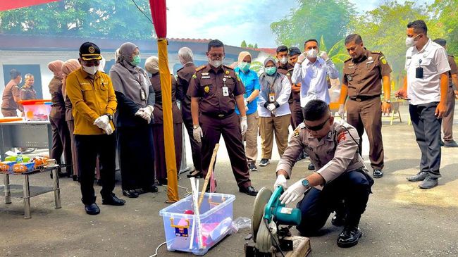 Proses pemusnahan barang bukti tersebut berlangsung di Kantor Kejari Banda Aceh di Jalan Teuku Chik Kuta Karang Nomor 1, Kecamatan Kuta Alam, Banda Aceh, Rabu (8/5/2024). Barang bukti dimusnahkan dengan cara dihancurkan, dibakar, dirusak, dan dipotong sehingga tidak dapat dipakai lagi.