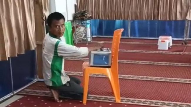 Dalam video tersebut tampak pelaku mengenakan baju lengan panjang berwarna putih dengan garis hijau dan celana training abu-abu. Ia awalnya hendak mencuri uang di dalam kotak amal masjid.