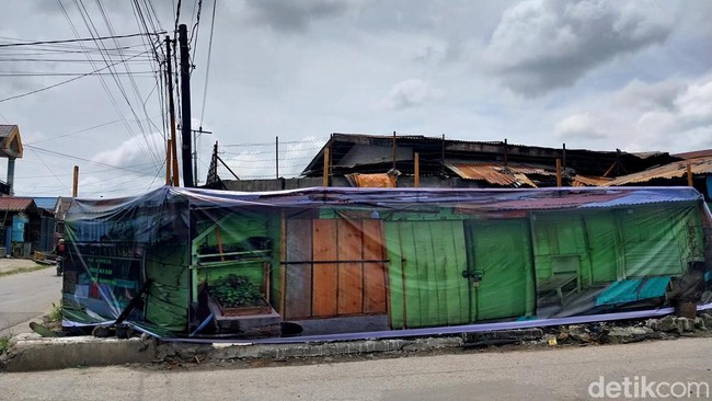 Bagian rumah Sempurna yang terbakar tampak ditutupi dengan spanduk bergambar rumah Sempurna Pasaribu sebelum dibakar. Di bagian dalam yang tertutup spanduk itu terlihat masih tersisa bekas material-material yang terbakar.