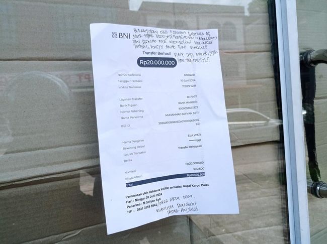 Dilihat detikSumut, pada Jumat (19/7/2024) selebaran itu berisi bukti transfer Bank BNI sebesar Rp 20 juta. Uang itu dikirim dari Ela Wati kepada kepada Muhammad Sofyan Seti tertanggal 10 Juni 2024.