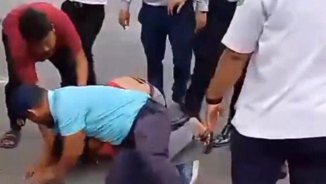 Tidak lama kemudian, datang seorang petugas Dishub langsung mendorong pria tersebut. Tidak lama kemudian, pria tersebut dipiting dan dibanting ke aspal dalam keadaan dipiting.