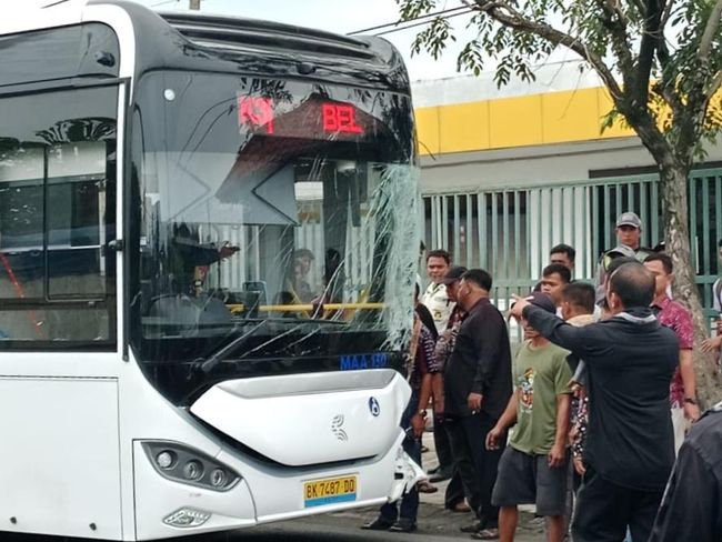 Tiga kendaraan yang lagi parkir di Jalan Yos Sudarso, Kecamatan Medan Belawan, Medan, ditabrak bus listrik milik Pemerintah Kota (Pemkot) Medan. Polisi menyebut kecelakaan terjadi karena human error.