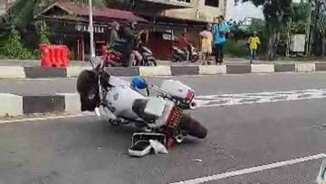 Dari video berdurasi 54 derik yang dilihat detikSumut, Sabtu (4/1/2024), terlihat motor patwal polisi tergeletak di tengah jalan. Perekam video menyebut menyebut motor tersebut menabrak trotoar jalan.