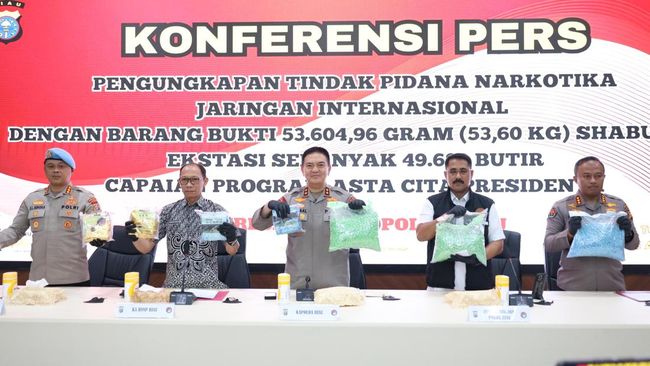 Direktorat Narkoba Polda Riau kembali menggagalkan peredaran 53,6 Kg sabu dan 49 ribu butir pil ekstasi. Selain itu polisi turut mengamankan 4 orang diduga kurir.