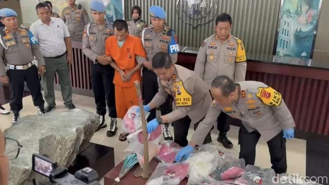 Indra ikut diperlihatkan kepada wartawan. Tersangka terlihat diborgol dan hanya tertunduk dengan memakai baju tahanan.