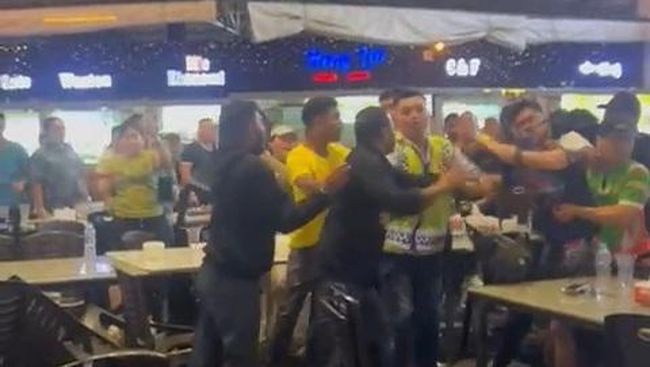 Dalam video juga terlihat, seorang pria sampai menaiki meja untuk menendang pengunjung yang mengenakan baju dan celana hitam. Pria lain juga tampak memukuli pria tersebut dengan kursi plastik.