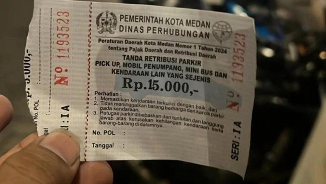 Dalam unggahan yang dilihat, karcis parkir itu memiliki nomor kode dan dikeluarkan Dishub Medan. Namun nilai yang tertulis dalam karcis itu Rp 15 ribu. Jika dilihat lebih seksama, tampak angka 1 pada nominal tersebut ditulis tangan.
