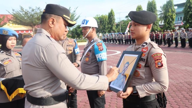 Upacara Pemberhentian Tidak Dengan Hormat (PTDH) berlangsung di Lapangan Sarja Arya Racana Polres Aceh Timur, Selasa (26/8/2025). Akhyar tidak hadir sehingga pemecatan dilakukan secara in absentia.