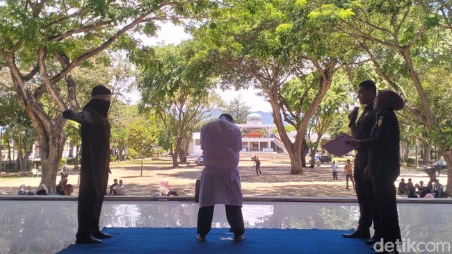 Pantauan detikSumut, ekseskusi cambuk kedua terpidana berlangsung di Taman Bustanussalatin (Taman Sari) Banda Aceh, Selasa (26/8/2025). Keduanya dicambuk bersama delapan terpidana lainnya.