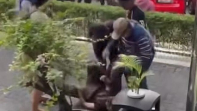 Selain itu, ada juga pria yang mengenakan baju dengan motif garis-garis dan mengenakan topi turut menarik rambut korban dan menyeretnya.