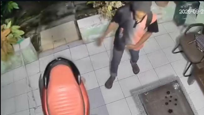Lalu, terlihat ada seorang pria menggunakan topi, masuk ke teras dan mendorong motor tersebut ke halaman rumah dan membawanya. Peristiwa itu disebut terjadi pada 23 September 2025 malam.