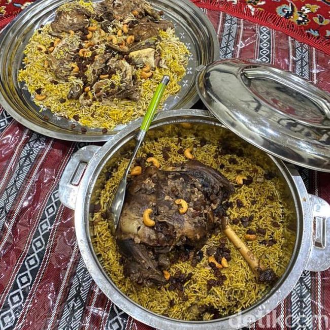 Detikers dapat menikmati menu Nasi Mandhi, hidangan tradisional yang berasal dari Selatan Jazirah Arab. Nasi Mandhi disajikan dengan potongan daging kambing yang dibalur rempah-rempah. Cita rasanya sangat kuat.