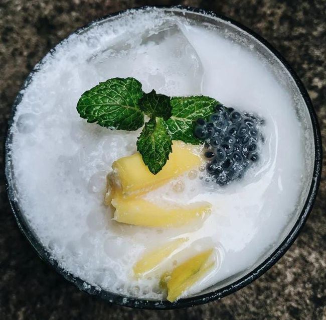 - Masukkan buah kuweni ke dalam gelas, lalu tuangkan kuah santan ke dalam gelas tersebut.