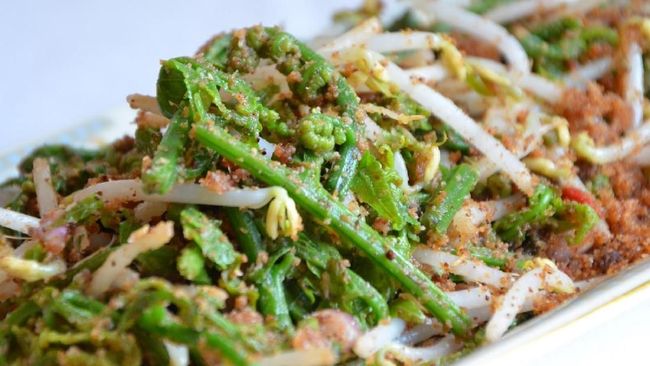- Setelah pakis dan toge matang, campurkan dengan bumbu yang telah disangrai, diiris dan dihaluskan, aduk hingga merata dan siap dihidangkan.