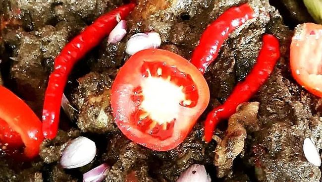 - Kemudian masukkan darah ayam, aduk cepat agar darahnya tidak menggumpal dan akan matang merata oleh garam dan asam. Sekitar 30 menit kemudian, darah ini akan berubah jadi coklat kehitaman dan mengental.