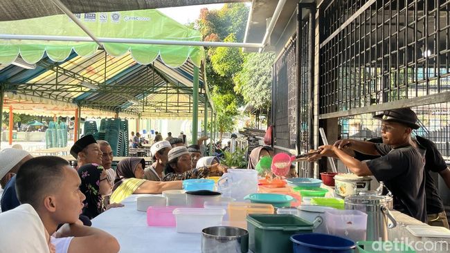 Berdasarkan pantauan detikSumut, Sabtu (1/3/2025), ada belasan wadah dari mangkuk, baskom, hingga rantang yang berjejer di meja dapur umum masjid. Para petugas dapur secara bergantian mengisi wadah para warga tersebut.