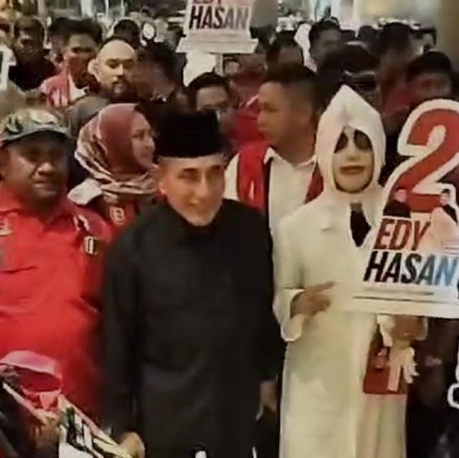 Ada calon Wakil Gubernur Sumut Hasan Basri Sagala dan Sekretaris PDIP Sumut Sutarto yang turut mendampingi Edy. Di samping Edy tampak ada seseorang yang berpakaian pocong sambil membawa poster nomor 2 bertuliskan Edy-Hasan.